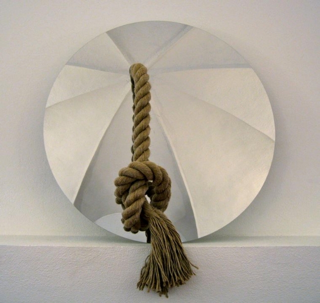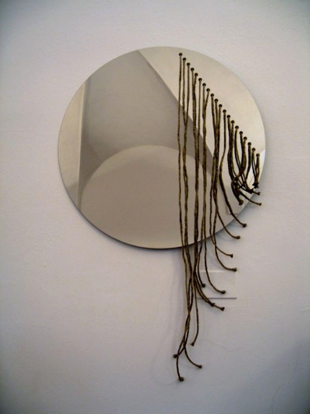 There is an excess of objects which cross the threshold of Art and Design. This excess is linked to mere aesthetics, dimensions and perception before practicality. However, Eugenio Moi’s mirrors are not only a work of art, they are functional too. The sense of perception involved is also of contemplation, vision. You reflect yourself on their polished surfaces, extracted in a perfect circle of reflective steel. Futhermore, each time you look at yourself you become a contemporary artist , you are a fleeting portrait. The artistic work on the steel discs adorn and decorate your image. Coarse cords which exult achievement and bonds, soft leather filaments rhythmically intertwined elliptic and flaming red cloth embroidered in cross stitch depicting temptation and the forbidden, tangled threads which flower from the cold polished steel, insinuating that the cohabitation of difference is not possible, it is beautiful. When design exceeds in achieving extrinsic qualities it mirrors art, so much so that it becomes unrecognizable.